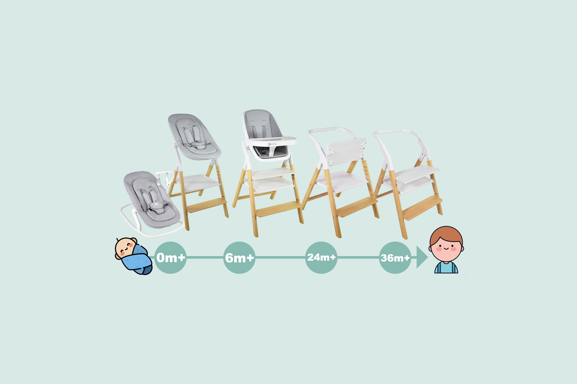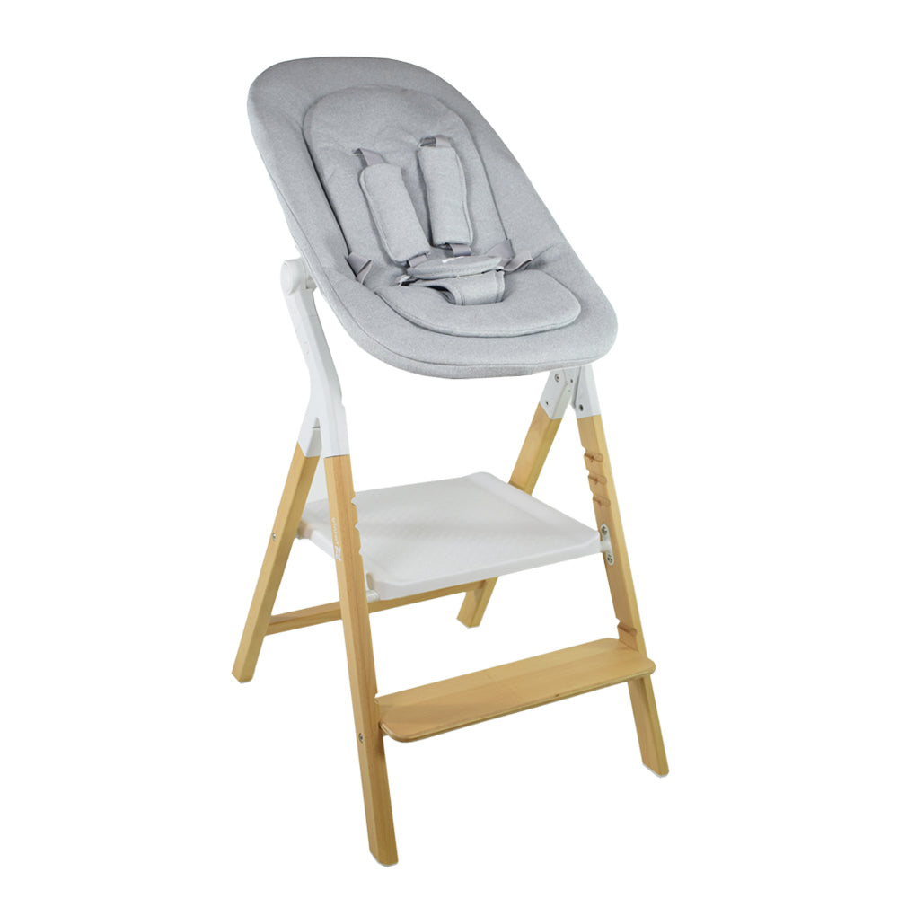Permite que el bebé esté elevado a la altura de la mesa. Reclinable en 2 posiciones, adaptable al crecimiento del bebé y a diferentes momentos del día (jugar, descansar) quitando y poniendo el arco de juguetes. Base estable y segura intercambiable en 5 segundos.